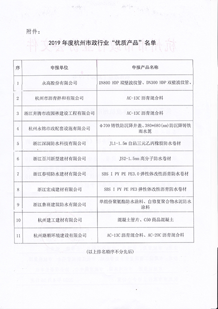 浙江省杭州市市政行業協會辦公室發布了2019年度杭州市政行業“優質產品”認定結果。為貫徹落實黨中央、國務院《關于開展質量提升行動的指導意見》和省、市政府實施計劃的有關精神,促進提高市政行業產品質量和服務質量,杭州市市政行業協會秘書處組織開展了2019年度杭州市政行業“優質產品”認定工作。經資格核查、申報材料認定、第三方檢測、專家審議和公示等環節,我公司生產的“JS2高分子防水卷材""榮獲2019年度杭州市政行業“優質產品”   稱號。